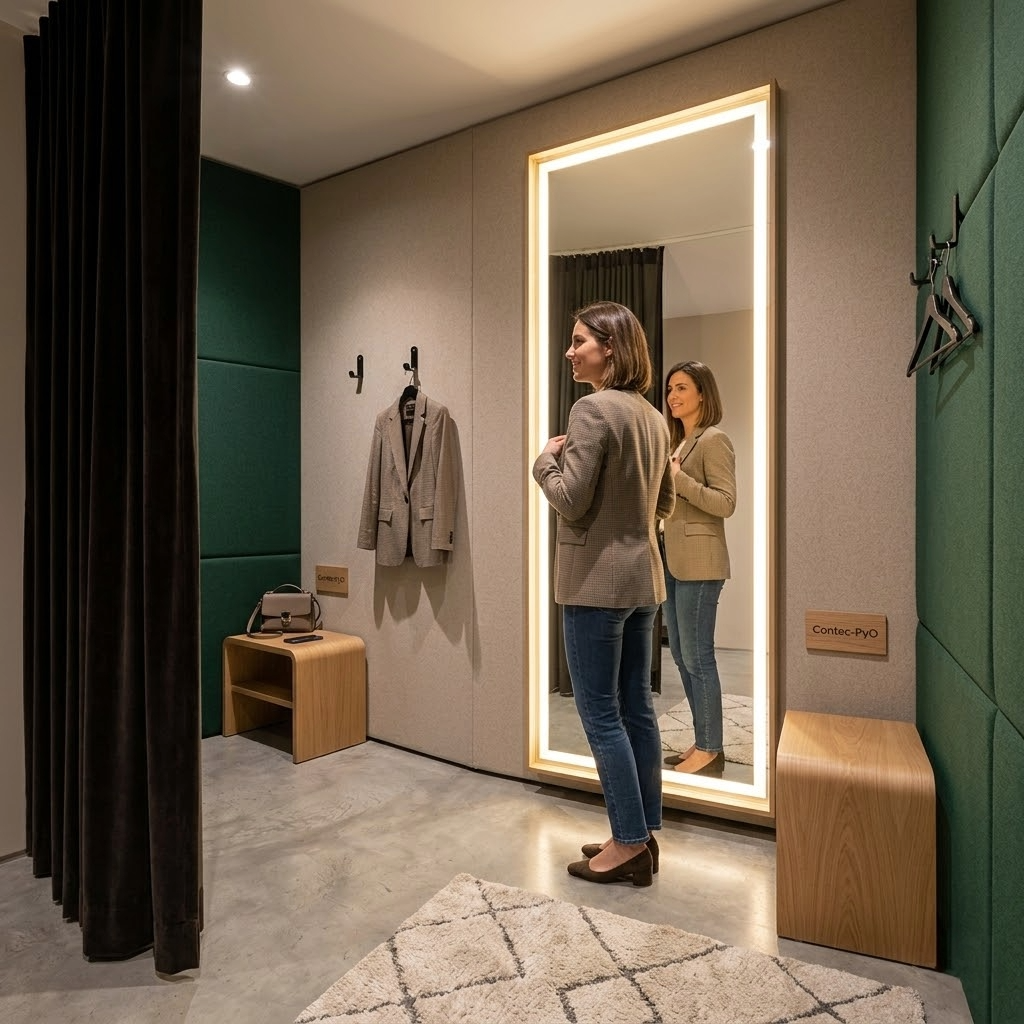 - La solución de Contec-PyO: Instalamos iluminación perimetral en el espejo (estilo camerino) o retroiluminación (backlight). Esto difumina las sombras y proporciona una luz uniforme que favorece al cliente. Además, utilizamos luminarias con un CRI (Índice de Reproducción Cromática) superior a 90, asegurando que el color de la prenda sea fiel a la realidad.